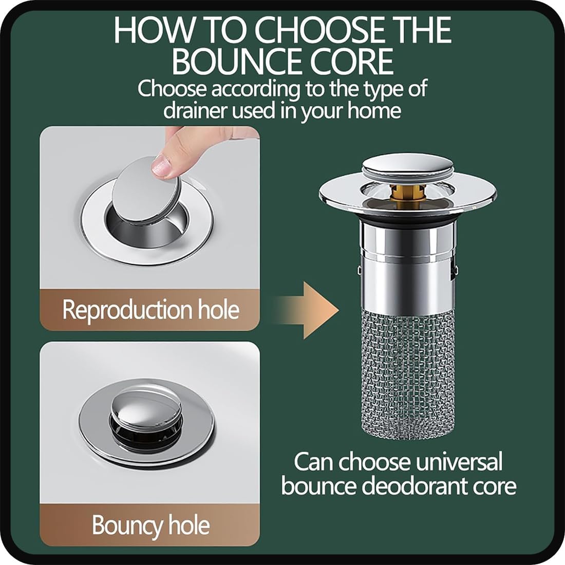 This sink bounce core drain strainer is designed to catch hair and prevent clogging in bathroom sinks. It features a pop-up mechanism for easy opening and closing of the drain, and a removable stainless steel filter basket for convenient cleaning.